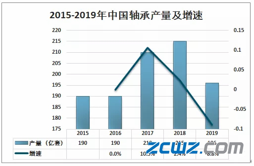 當(dāng)前,中國軸承行業(yè)已經(jīng)形成了產(chǎn)品門類基本齊全,生產(chǎn)布局較為合理的專業(yè)生產(chǎn)體系,并開始進(jìn)入由軸承大國向世界軸承工業(yè)強(qiáng)國邁進(jìn)的關(guān)鍵階段。2019年中國軸承產(chǎn)量為196億套,同比下降8.8%。