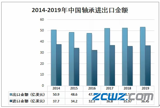 2019年中國軸承進(jìn)口金額為36.45億美元,同比增長1.3%;中國軸承出口金額為53.21億美元,同比增長1.3%。