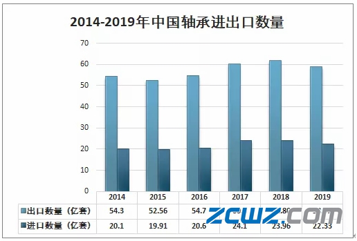 隨著中國軸承產(chǎn)品質(zhì)量的不斷提高,涌現(xiàn)一批精品軸承生產(chǎn)企業(yè),其產(chǎn)品質(zhì)量已與國際知名品牌相當(dāng),出口規(guī)模也在不斷擴(kuò)大。2019年中國軸承出口數(shù)量為58.87億套,同比下降4.7%;中國軸承進(jìn)口數(shù)量為22.33億套,同比下降6.8%。
